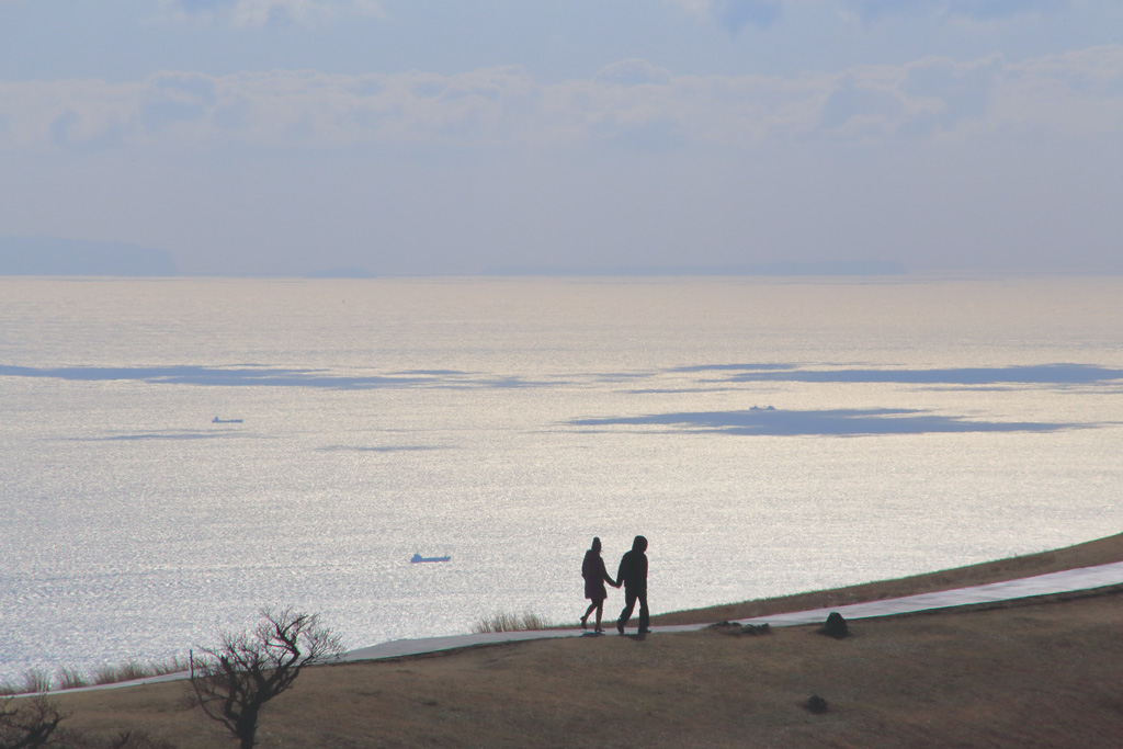 大海原を眼下に散歩するカップル(大室山山頂) |