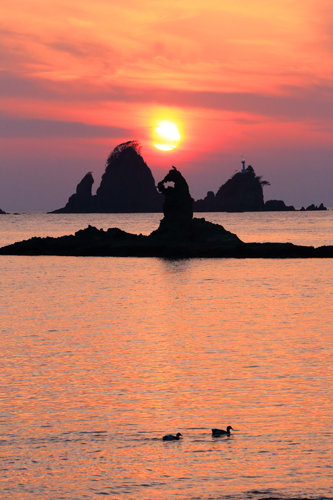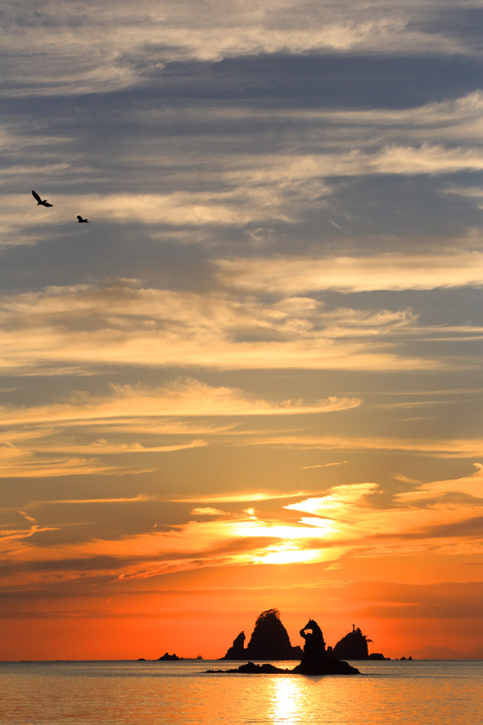 ゴジラ岩頭上のカモメと夕日 |