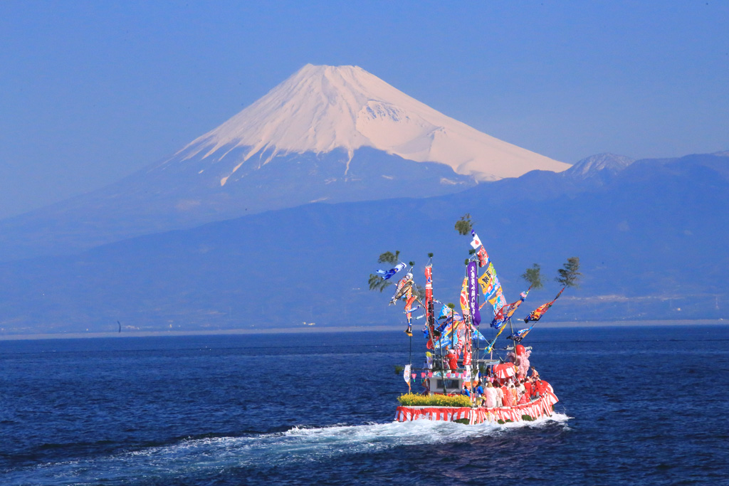 祭り衣装の若集を乗せた祭り舟が沼津市の各港から出航し駿河湾を横切り、「大瀬崎」の「大瀬神社」に奉納するお祭りです。