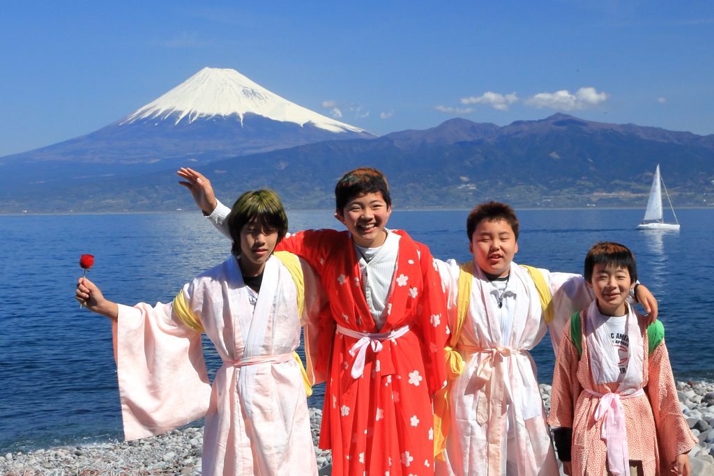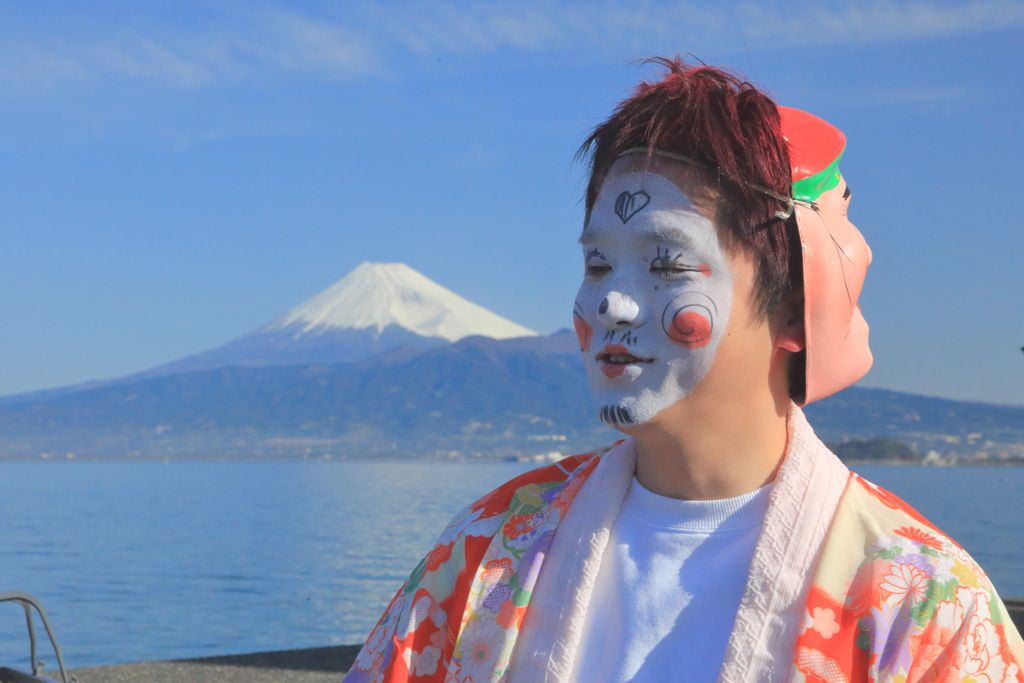 富士を背景にした祭り舟と、祭りの主役となる化粧した若集のスナップ写真を掲載しました。