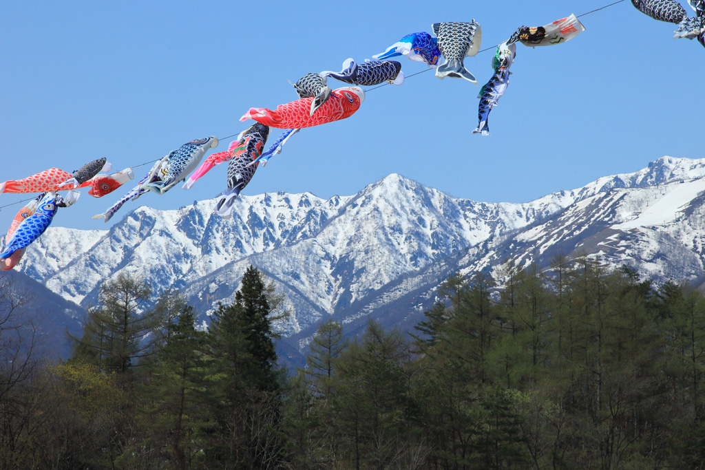 残雪を泳ぐ鯉のぼり(長野県白馬村) |