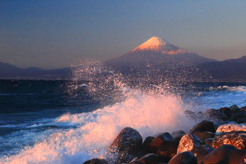 水平線に落ちる夕日に、波の飛沫と富士山がほんのりと赤く染まった写真が撮れました。