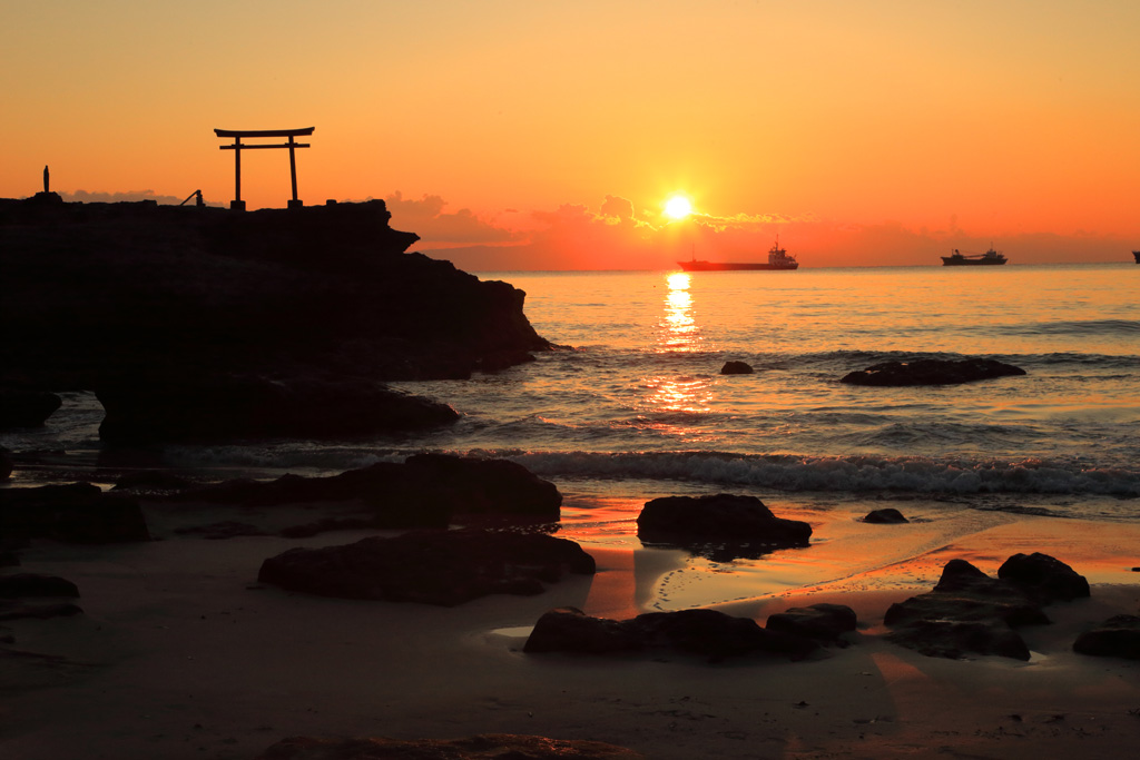 この「大明神岩」の鳥居に伊豆大島から昇る朝日が重なる、幻想的な光景を見ることができます。鳥居に昇る朝日を撮るには11月から3月までがベストです。