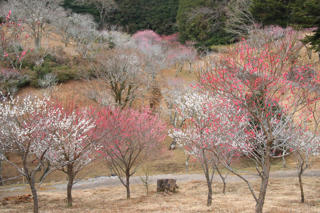 花数が少なめの老木が多いためか、華やかさに欠けているように見える梅林ですが、山間に展開する花風景は印象的でした。