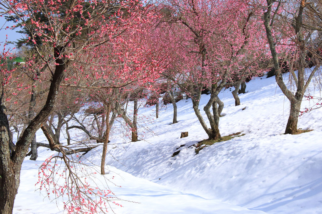 遠く冠雪した富士山が望める場所もあるので、富士山をバックにした写真を撮ることができます。訪れた日は伊豆には珍しく大雪が降った後で、雪の中の梅林の光景が見られて幸運でした。