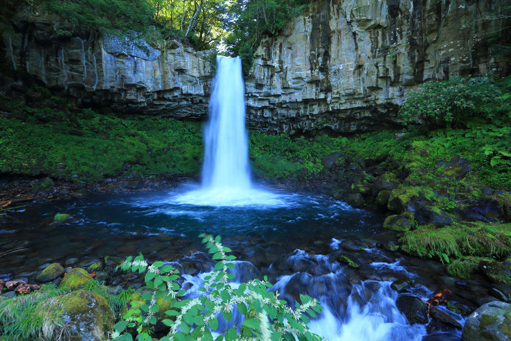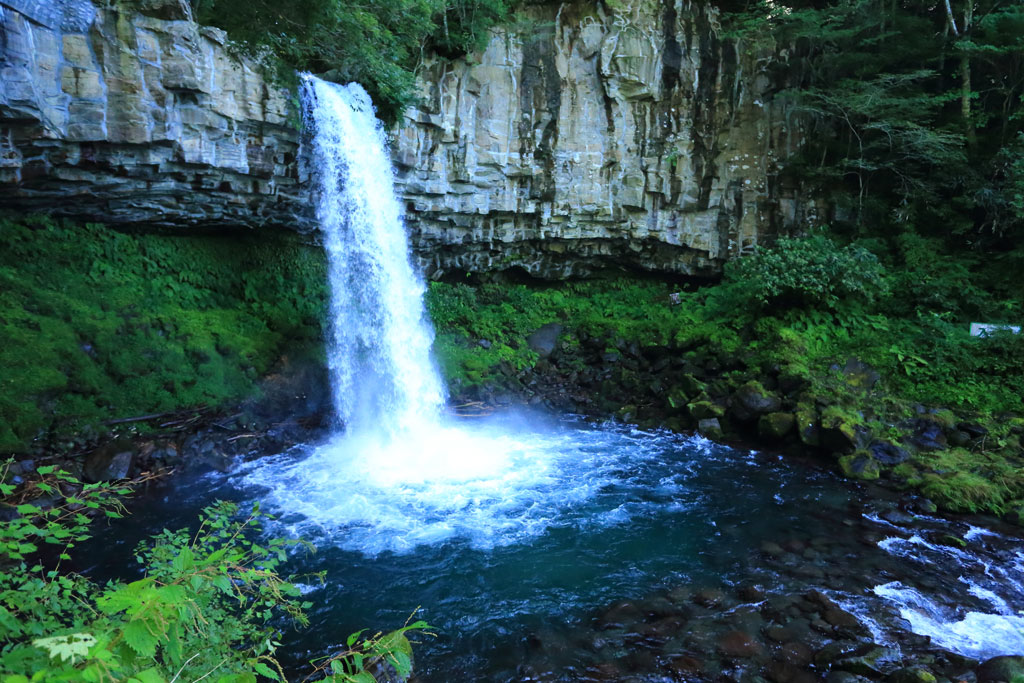 萬城の滝は柱状節理の岩盤でできており、瀑布とのコントラストが美しい滝です。