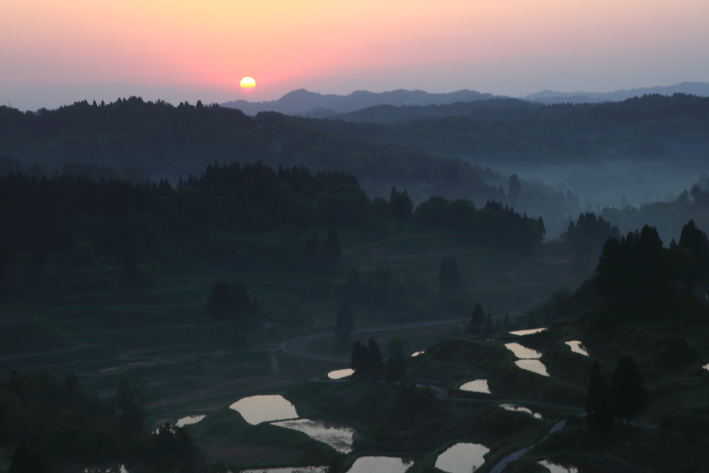 「松代蒲生の棚田」の日の出風景、初春の「長野県白馬村」、「北上展勝地」の桜風景のご紹介です。