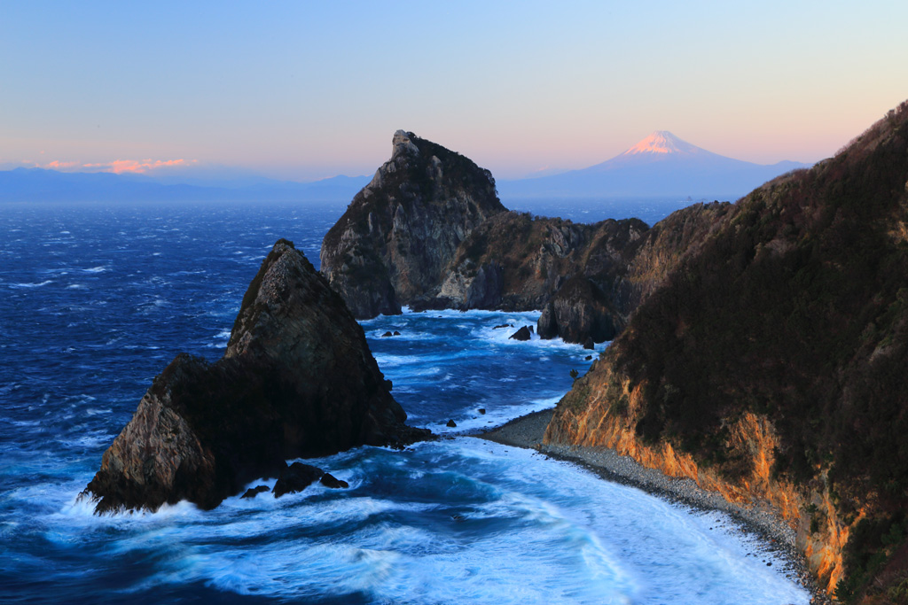 雄大な海岸線美を見せる千貫門は、夕日が海岸の岩肌の赤みを一層増し、遠望の富士山を背景に見事な夕景を演出してくれます。