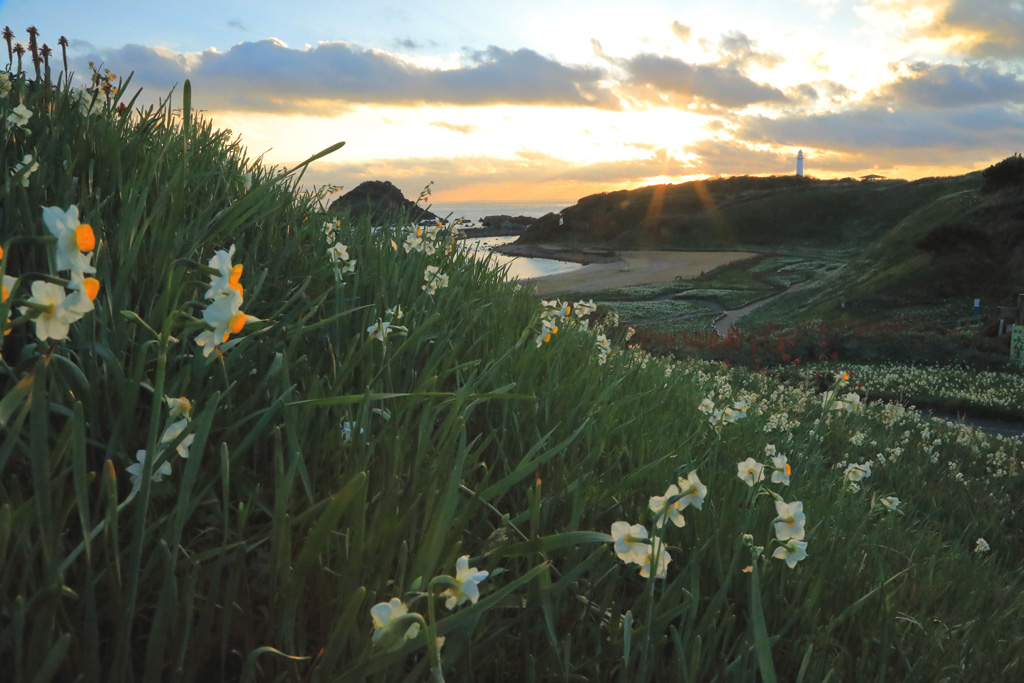 下田市からバスで15分ほどの「爪木崎(つめきさき)」は、初春に咲く花「水仙」の群生地として知られた観光スポットです。