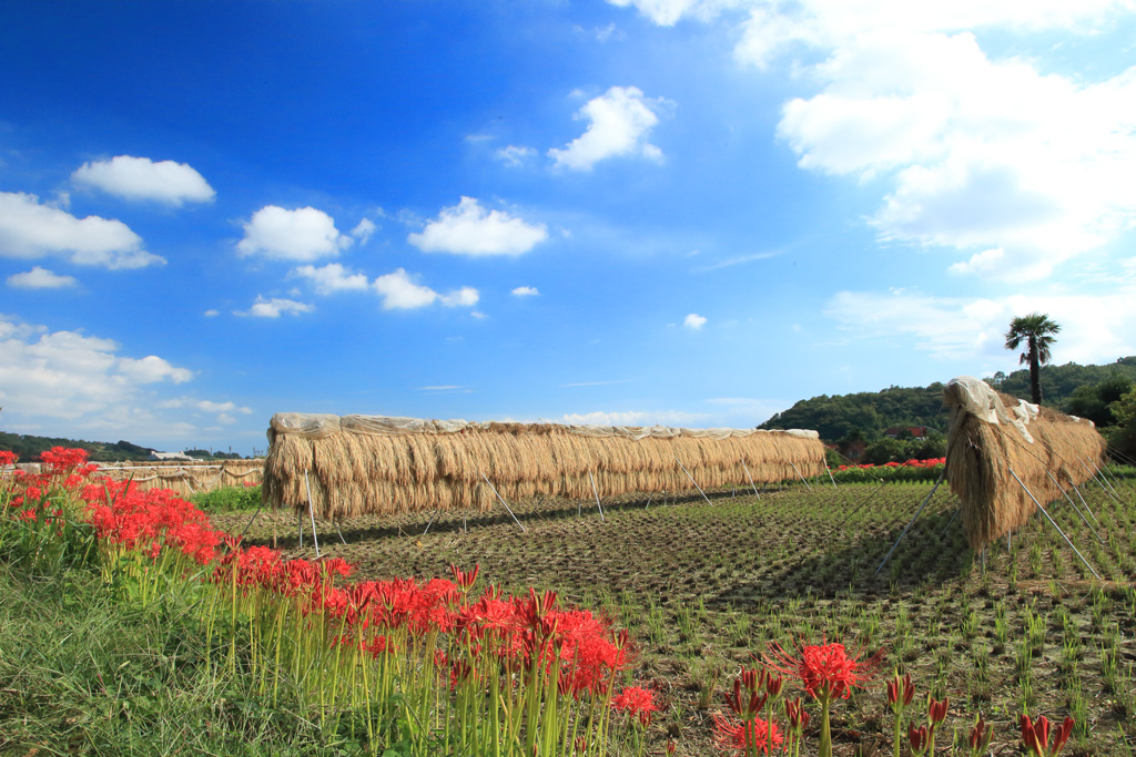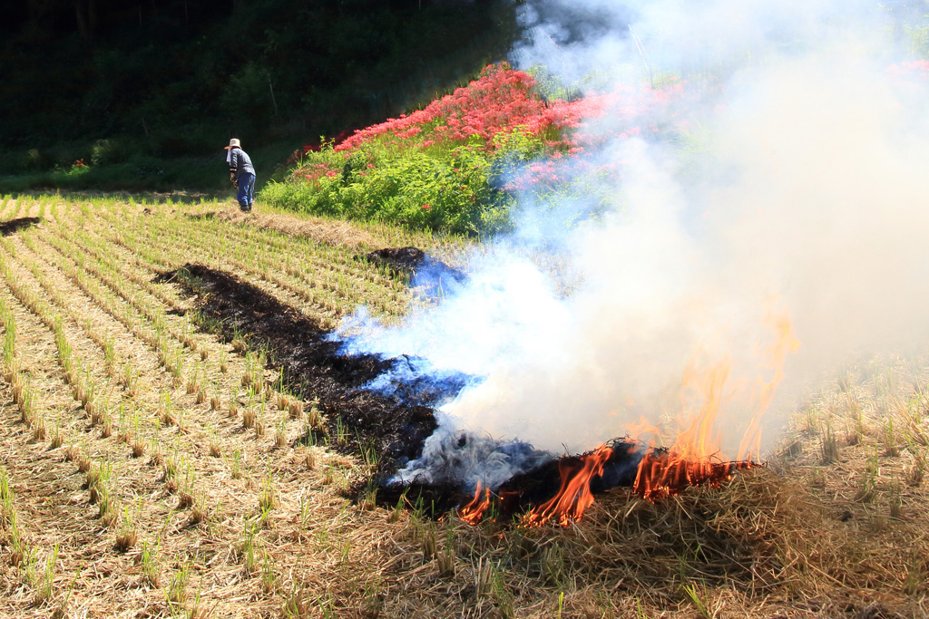 彼岸花の咲く時期の日向薬師では、稲の刈り入れの後の稲屑を集めて燃やしている、のどかな風景に出会うことができます。
